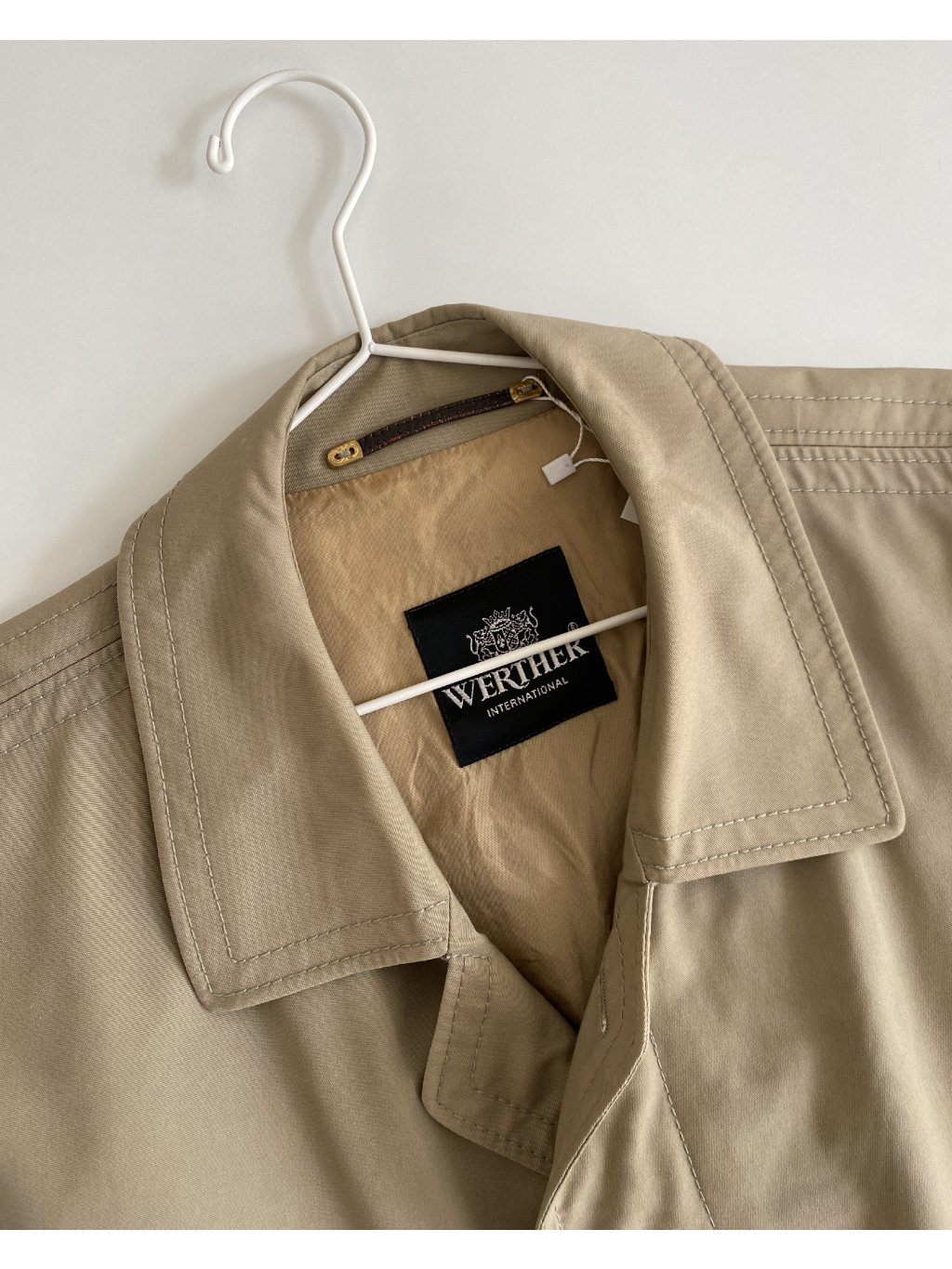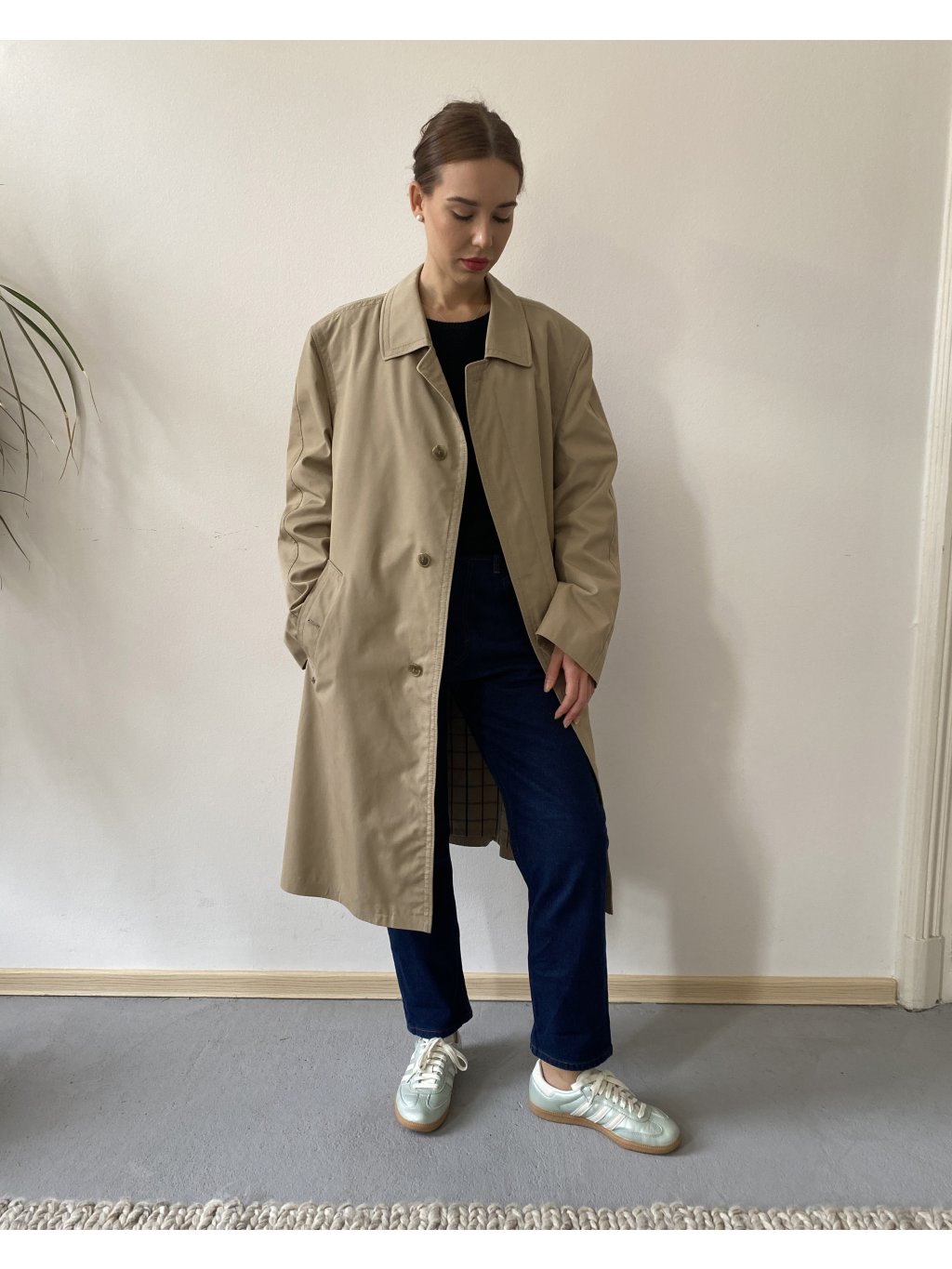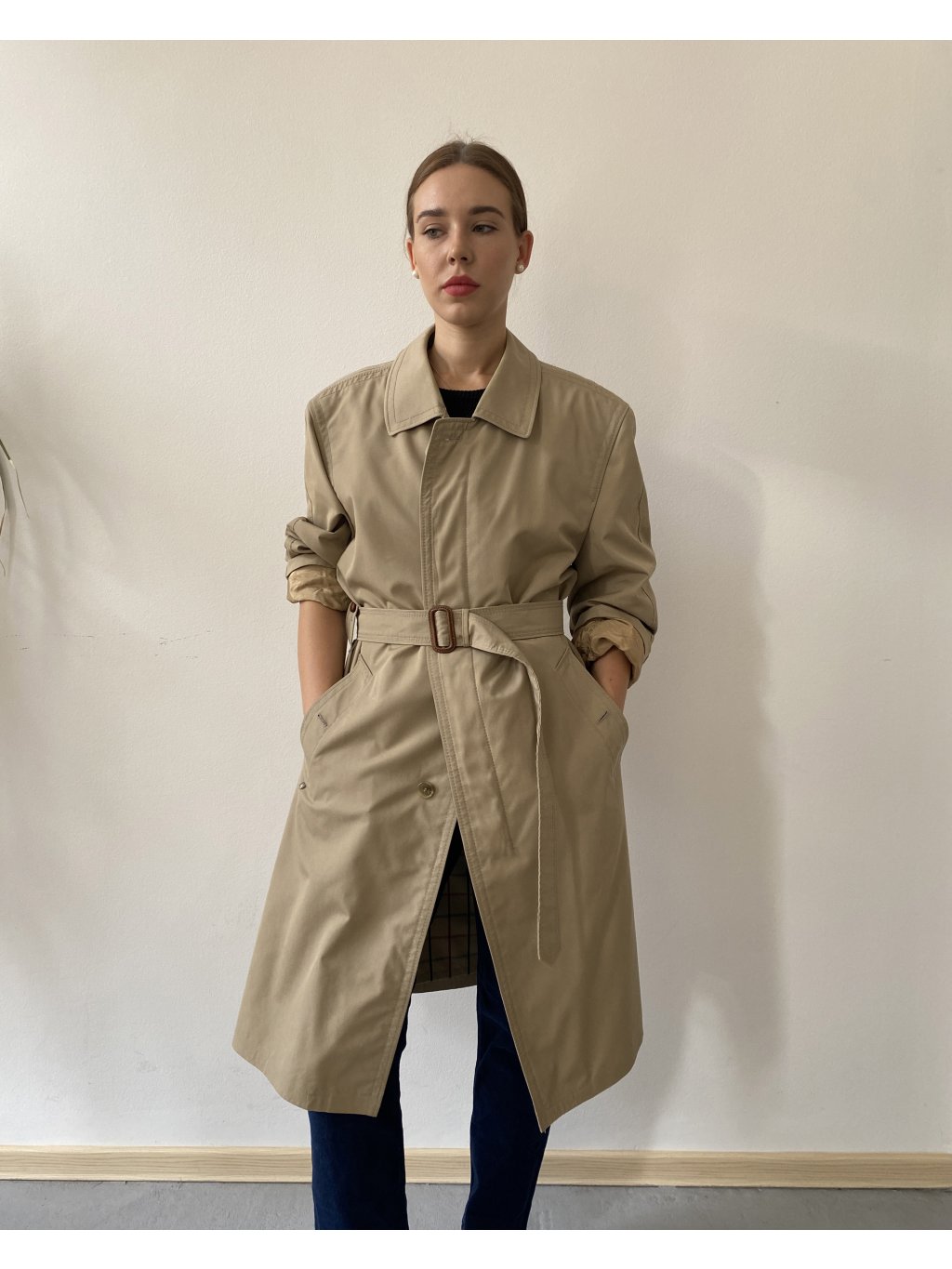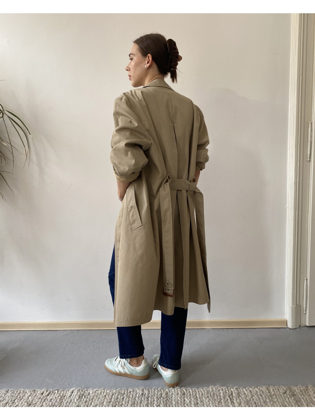 Béžový trenčkot s prímesou bavlny, ideálny na skoré jarné, ale aj jesenné dni. Hrubší pevnejší materiál. Veľmi kvalitne ušitý, pravdepodobne na mieru. Nadčasový kúsok vo výbornom vintage stave.
