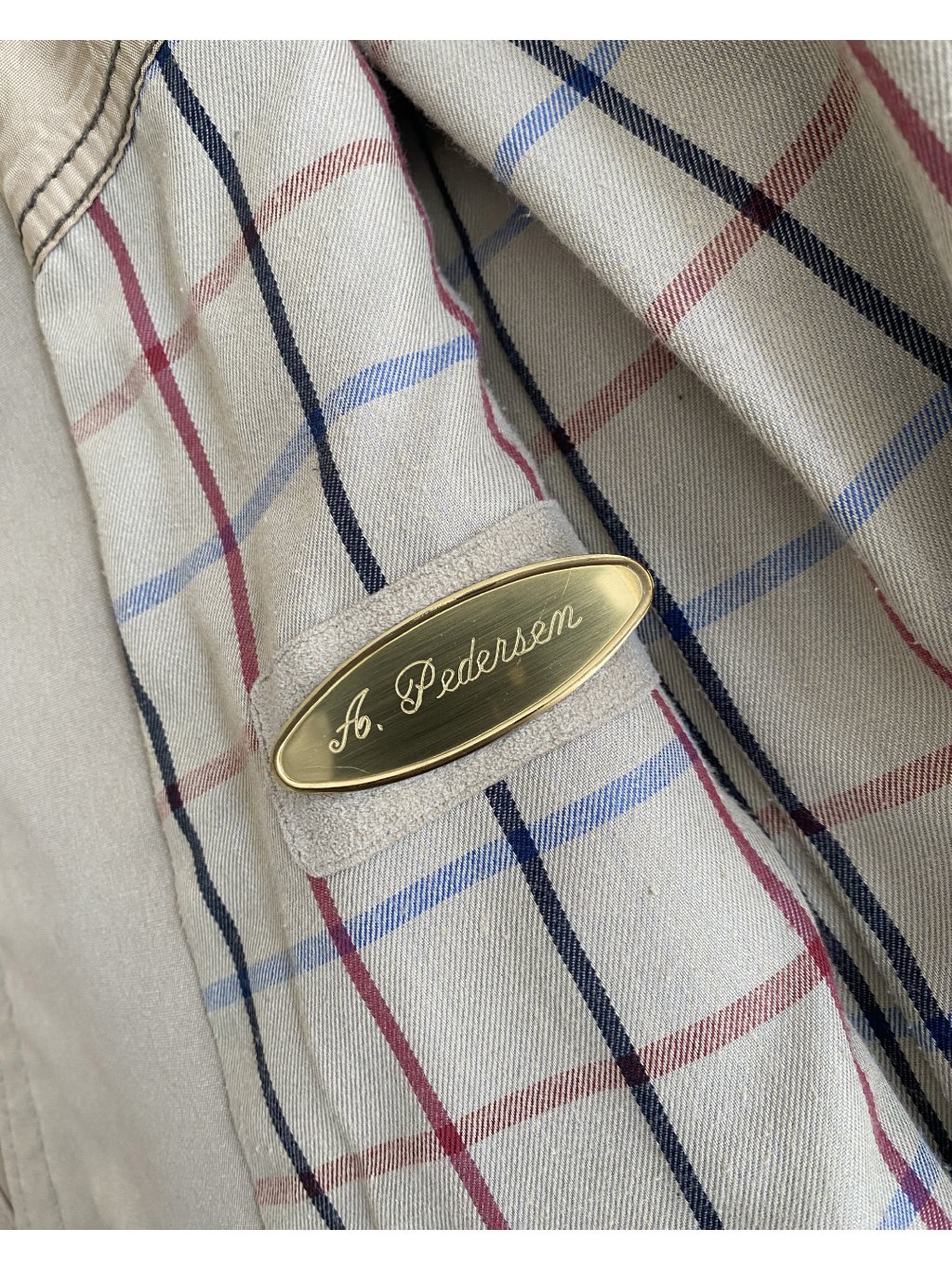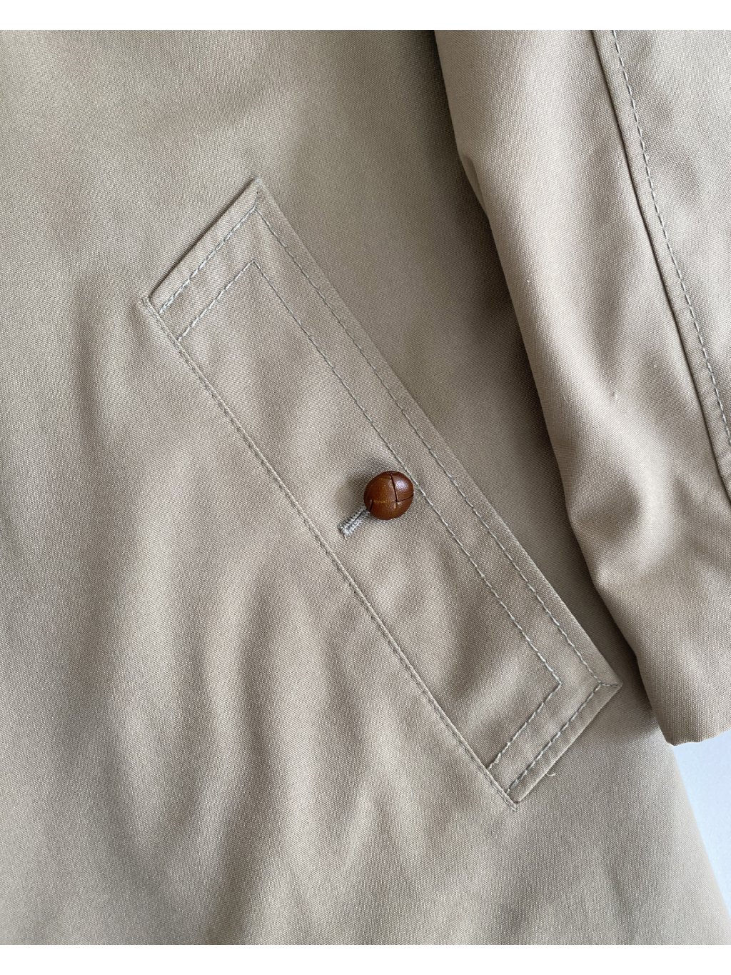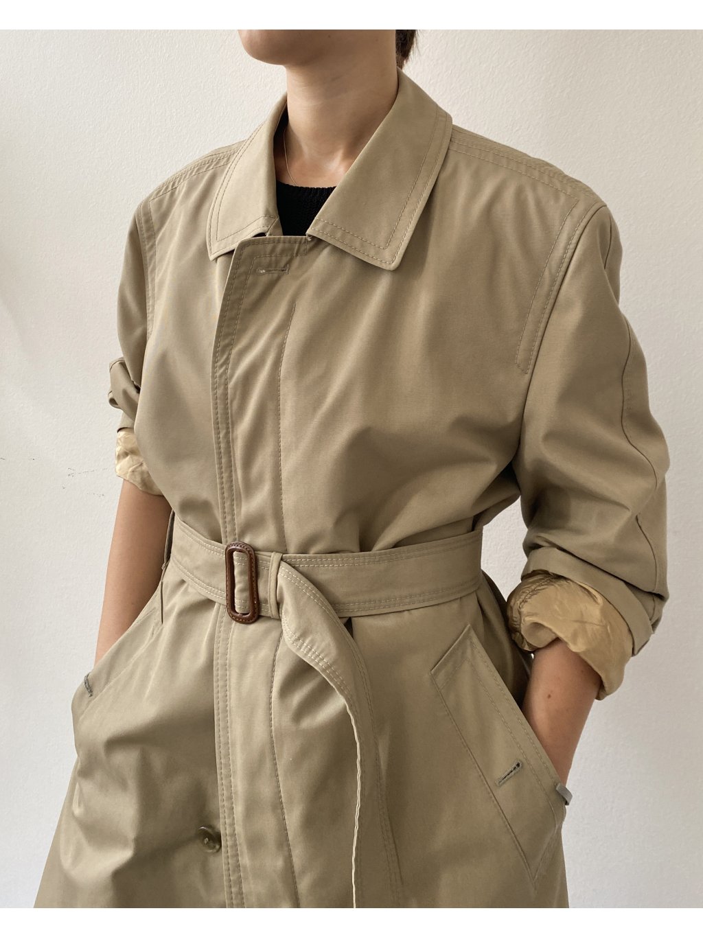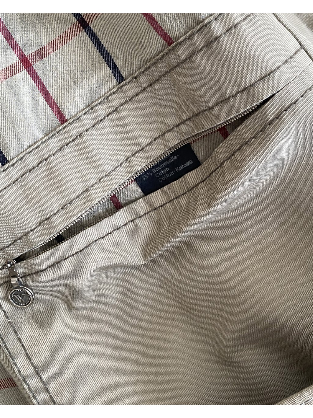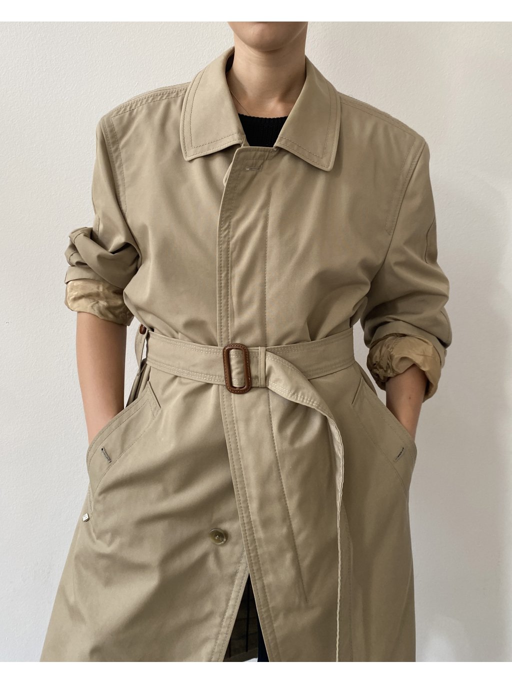 Béžový trenčkot s prímesou bavlny, ideálny na skoré jarné, ale aj jesenné dni. Hrubší pevnejší materiál. Veľmi kvalitne ušitý, pravdepodobne na mieru. Nadčasový kúsok vo výbornom vintage stave.