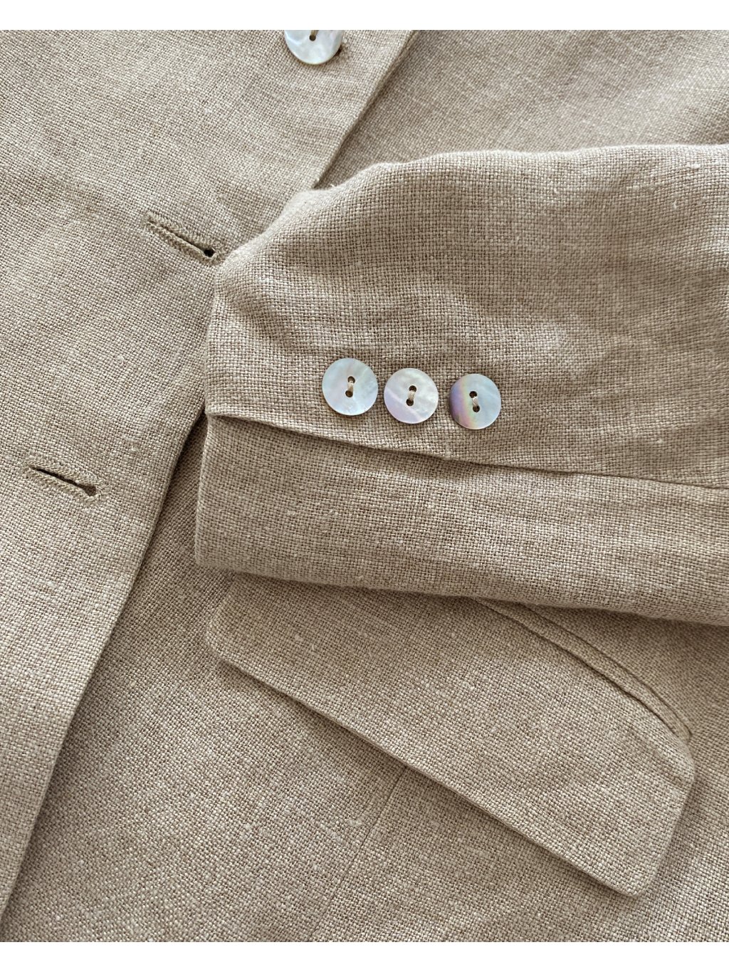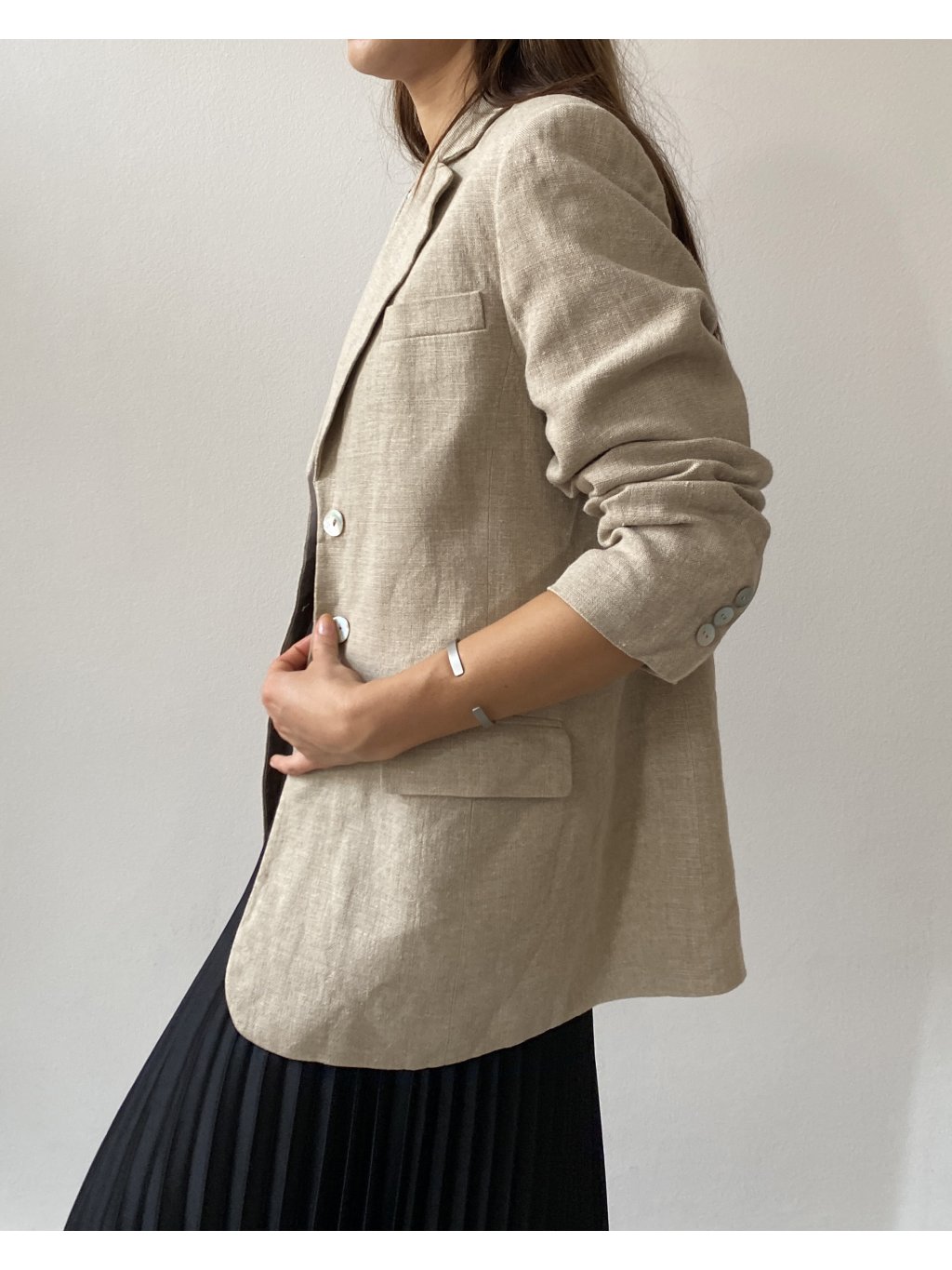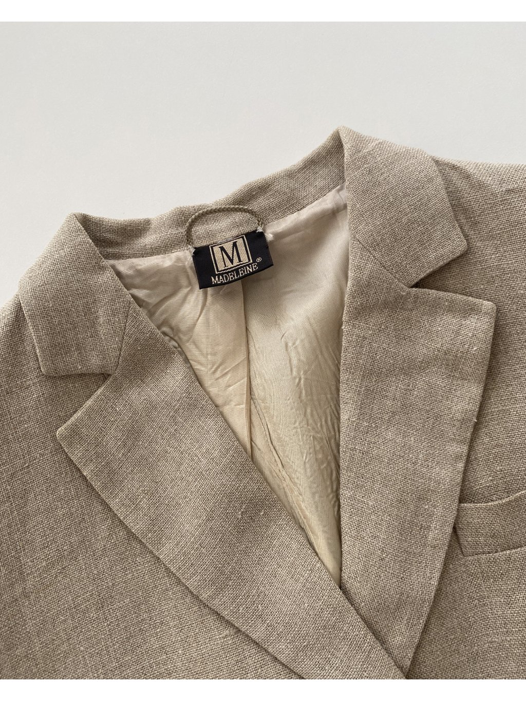 Sako exkluzívnej značky Madeleine. Veľmi pekný stav bez poškodení. Štítok s materiálom je bohužiaľ odstrihnutý, avšak je to určite prírodná tkanina- buď ľan alebo konopné vlákno. Cena podobných produktov od tejto značky sa pohybuje okolo 200 eur.