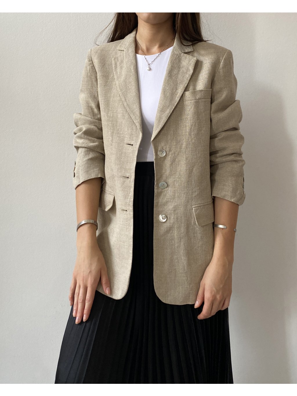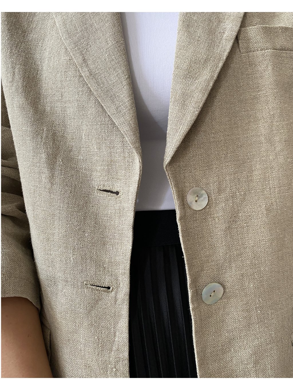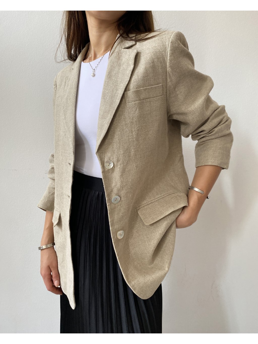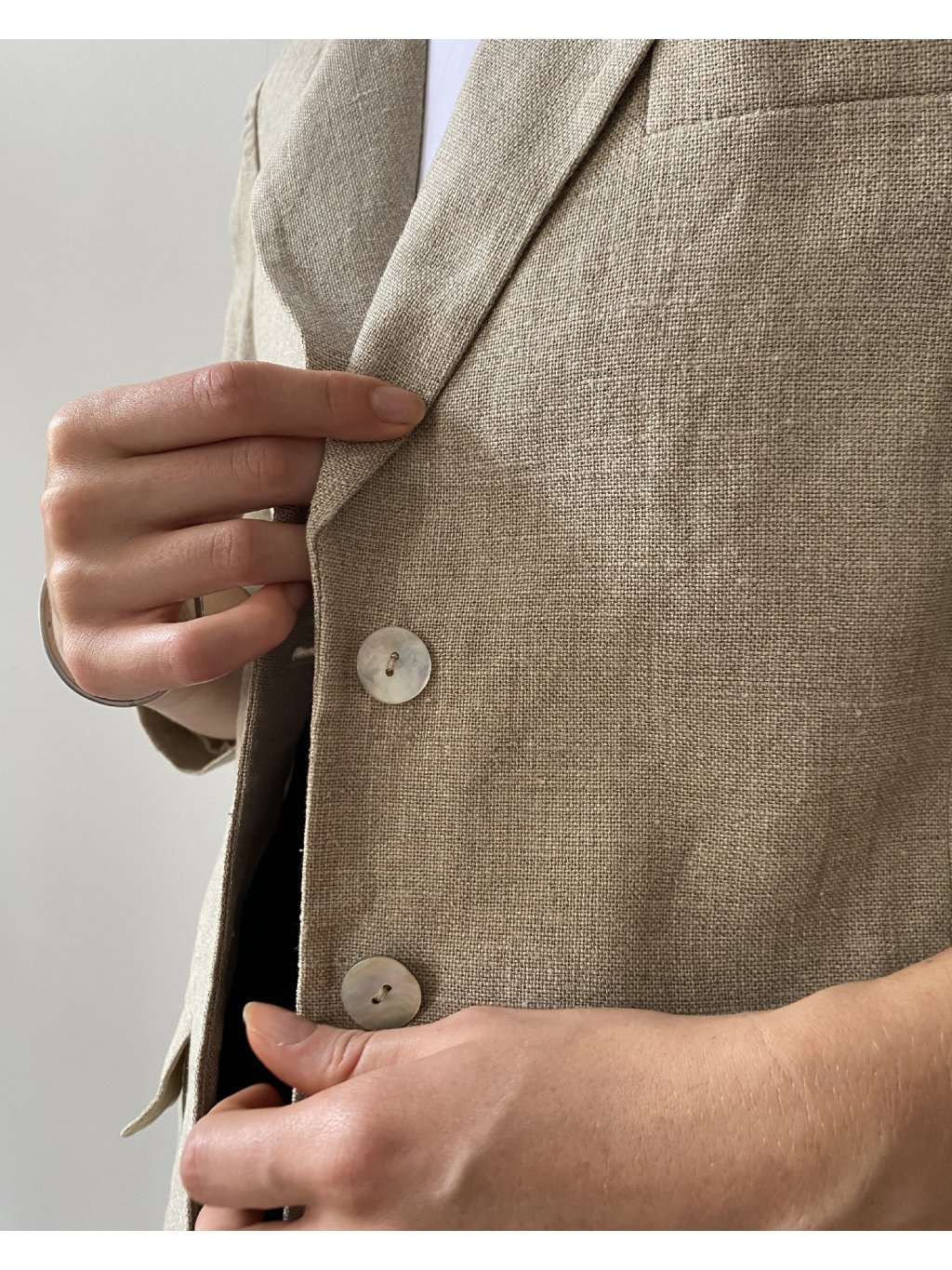 Sako exkluzívnej značky Madeleine. Veľmi pekný stav bez poškodení. Štítok s materiálom je bohužiaľ odstrihnutý, avšak je to určite prírodná tkanina- buď ľan alebo konopné vlákno. Cena podobných produktov od tejto značky sa pohybuje okolo 200 eur.