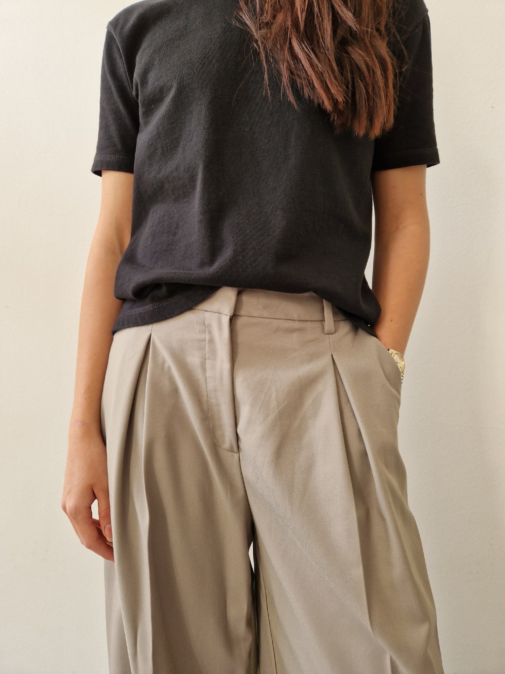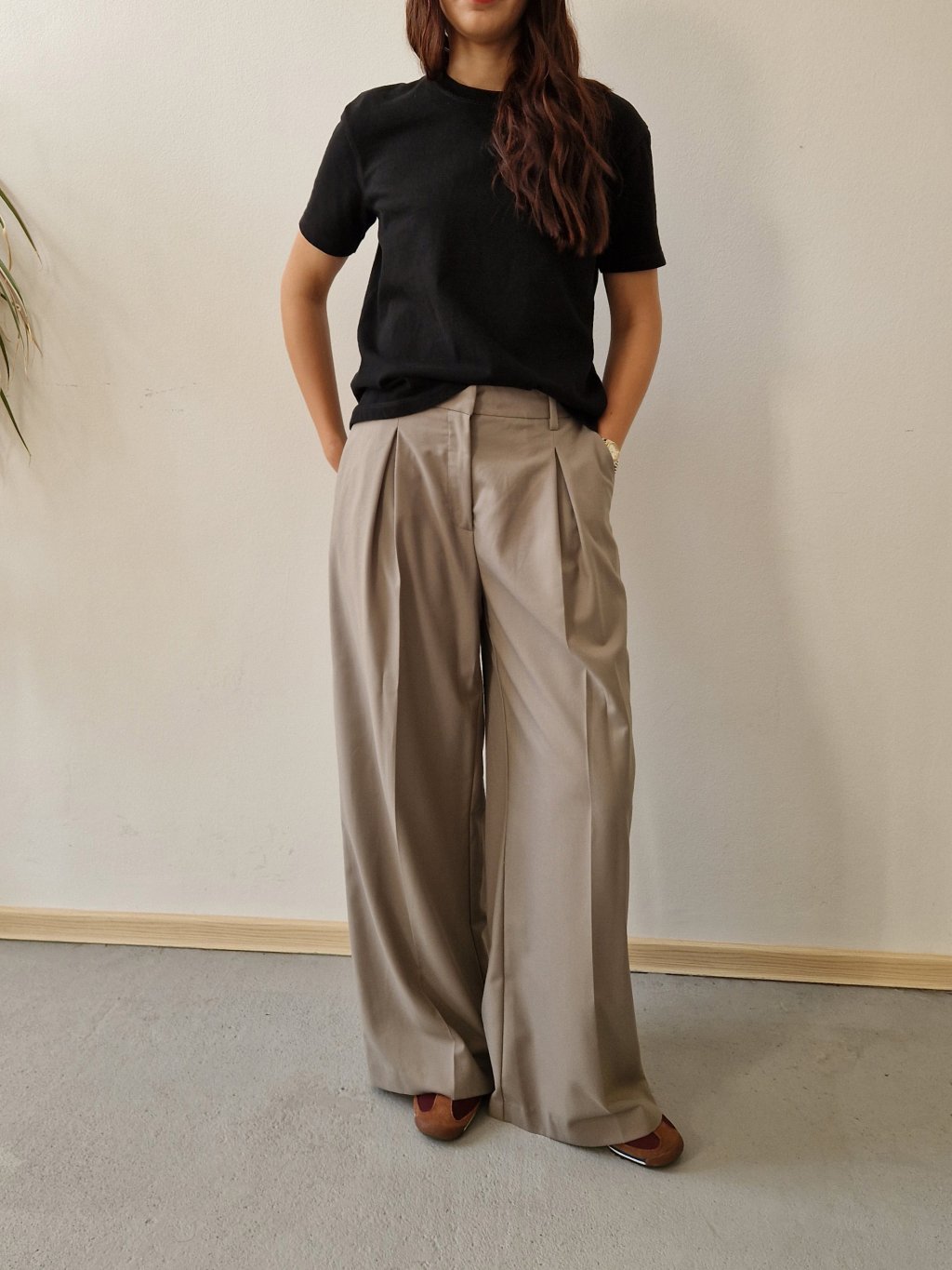 Dámske sivé plysé nohavice s vysokým pásom a nariasením. Ako nové.