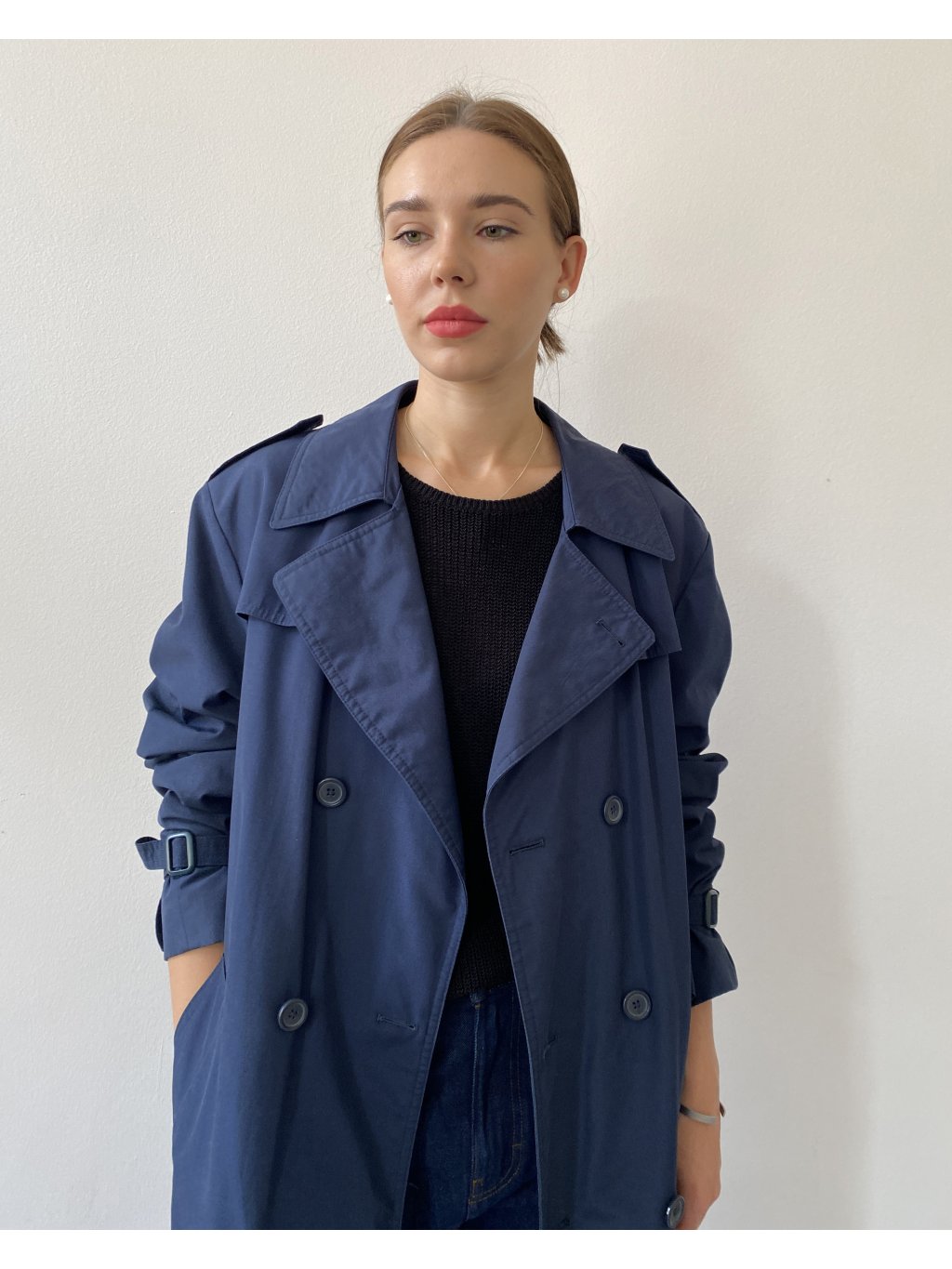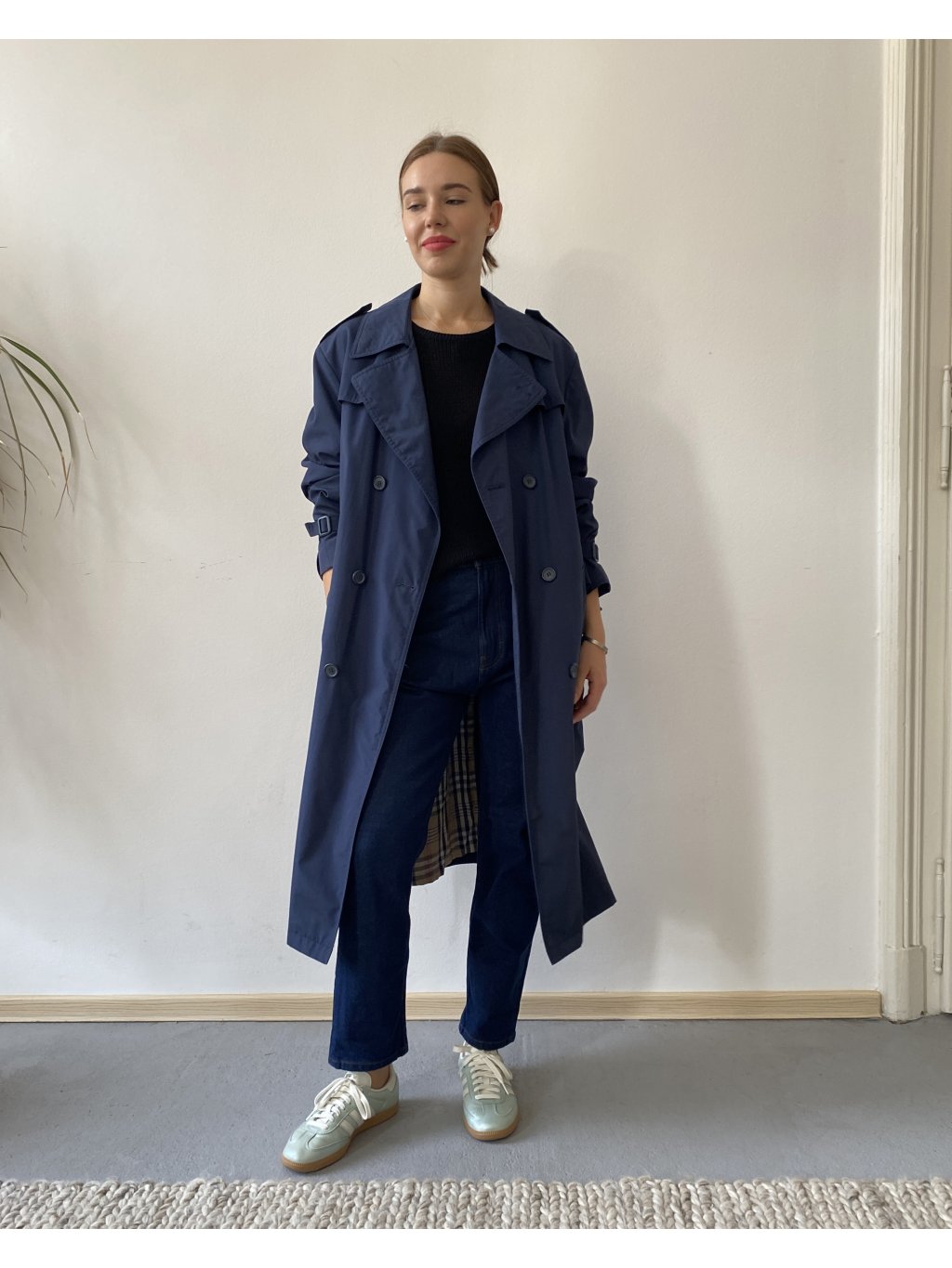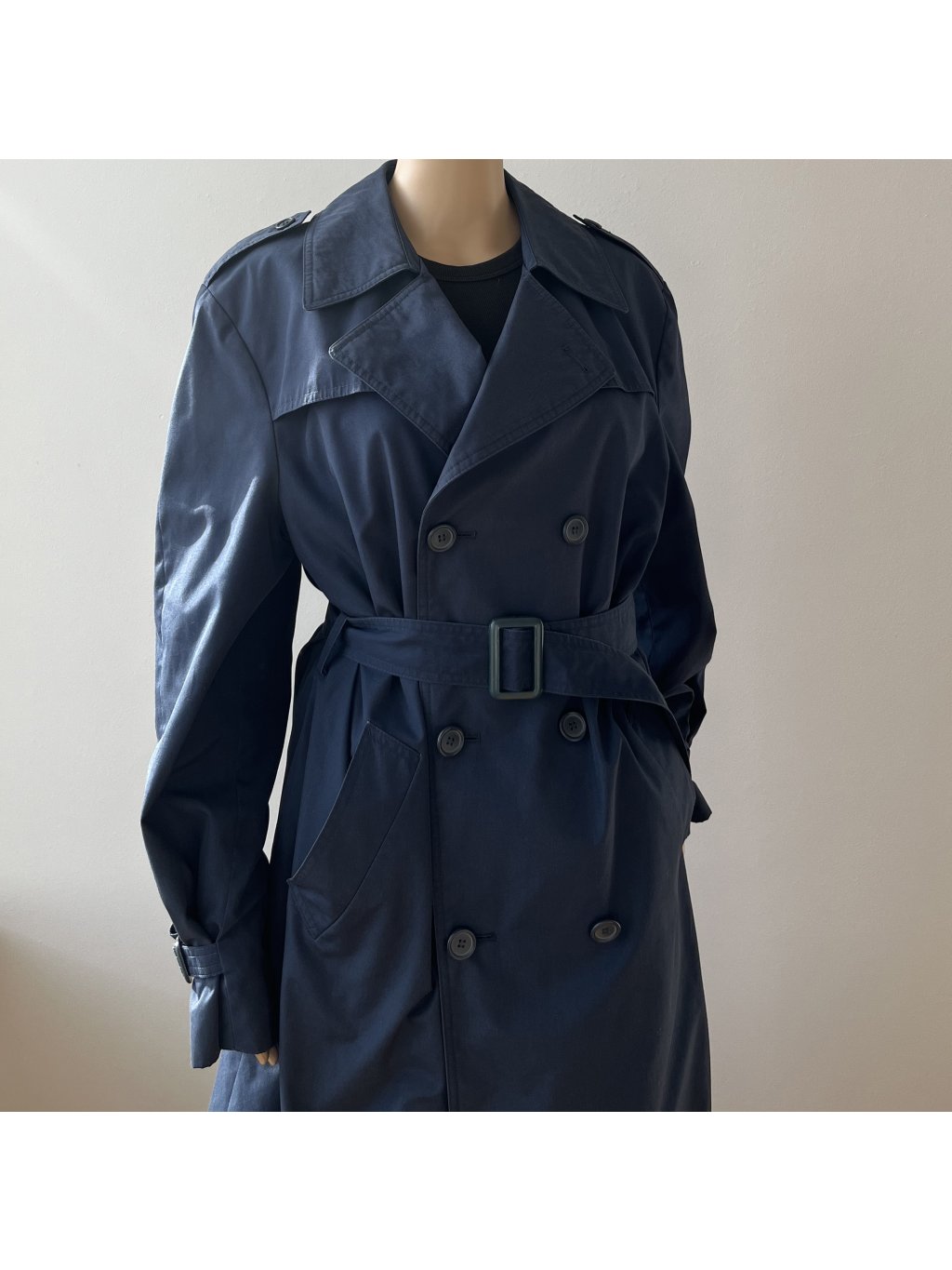 Dlhší tmavomodrý trenčkot s prímesou bavlny, ideálny na skoré jarné, ale aj jesenné dni. Hrubší pevnejší materiál. Nadčasový kúsok vo výbornom vintage stave.