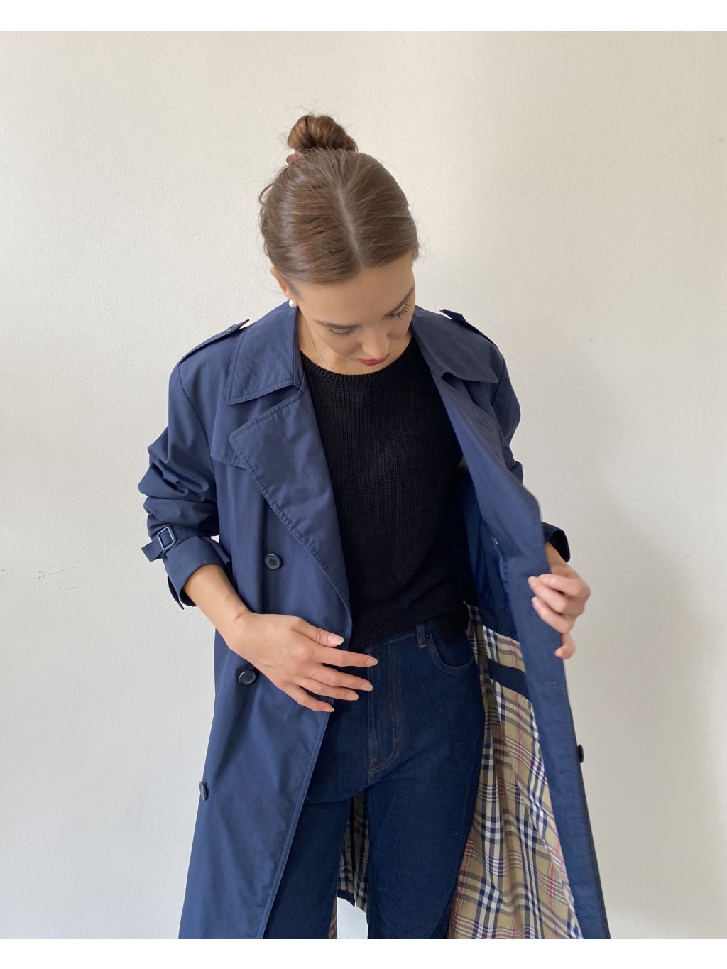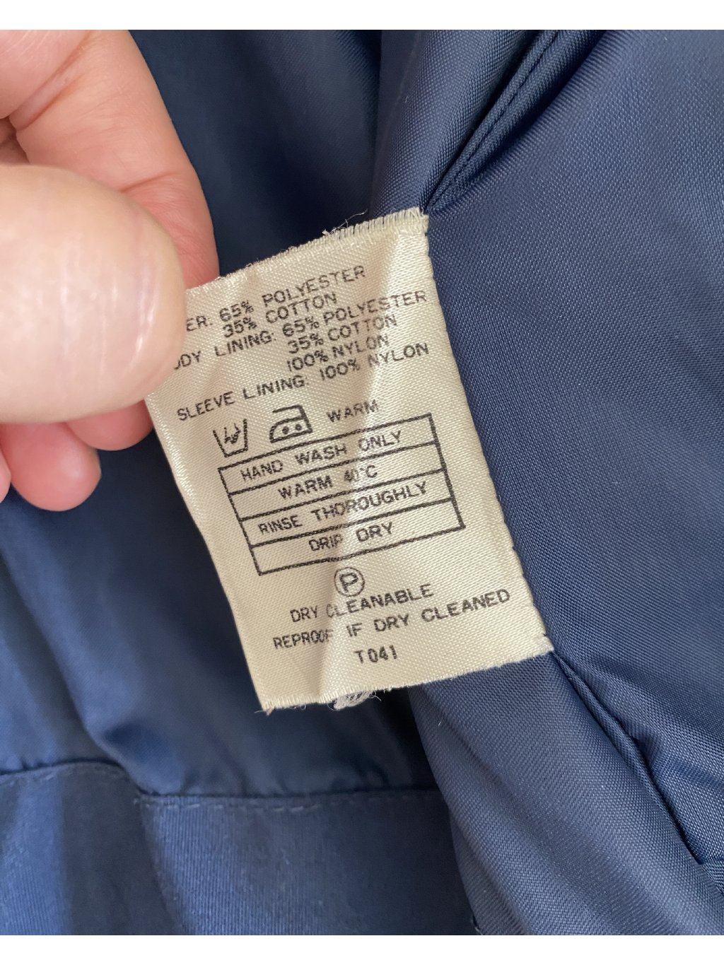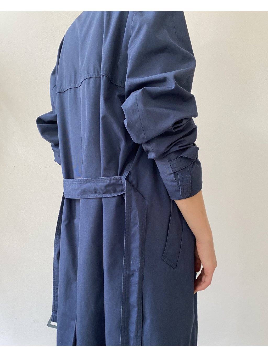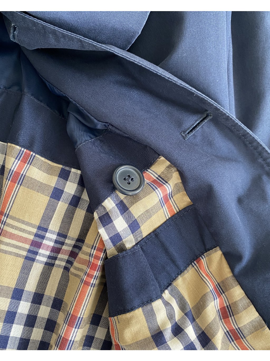 Dlhší tmavomodrý trenčkot s prímesou bavlny, ideálny na skoré jarné, ale aj jesenné dni. Hrubší pevnejší materiál. Nadčasový kúsok vo výbornom vintage stave.